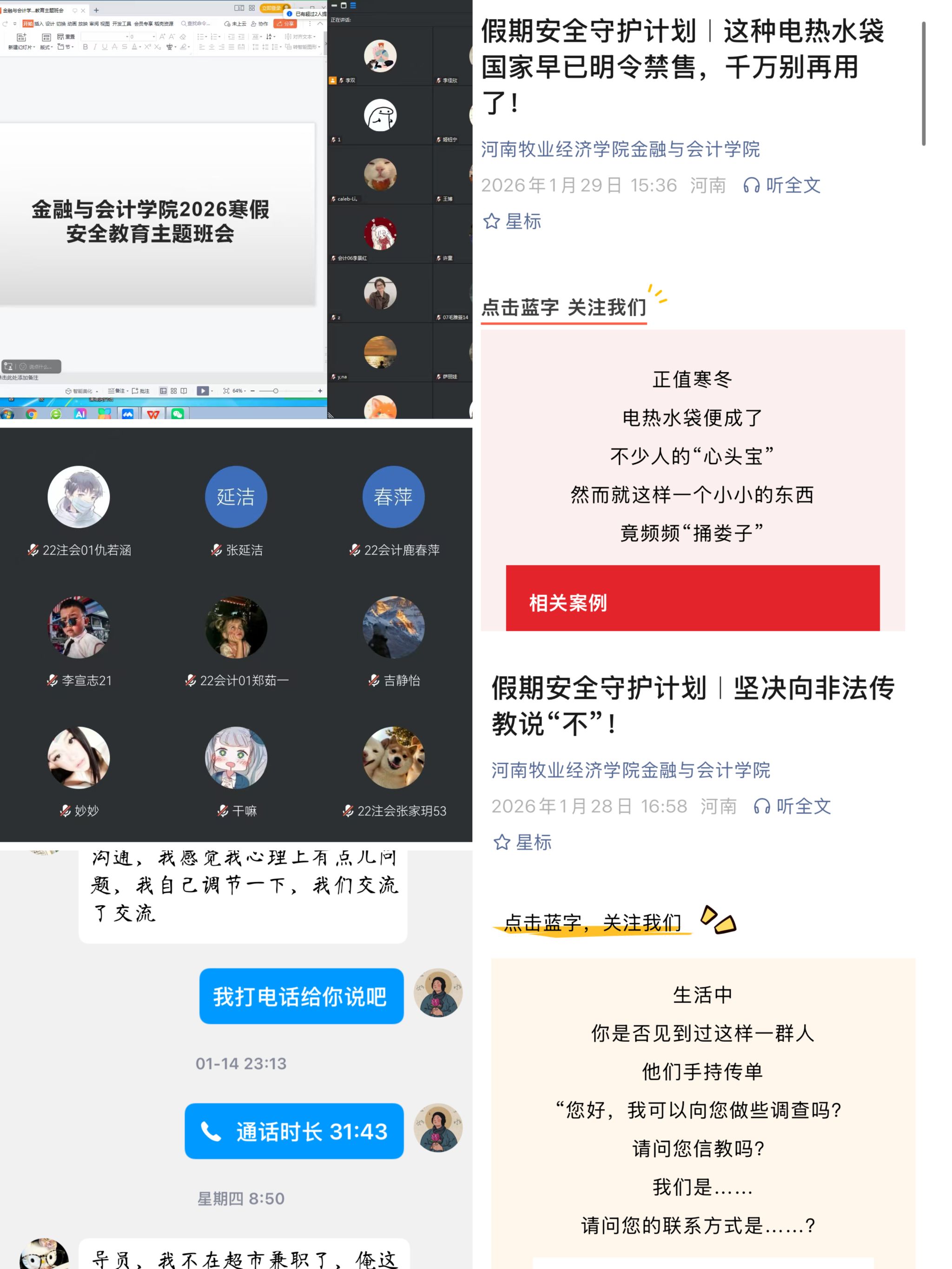 为切实增强学生安全防范意识与自我保护能力,引导学生度过一个充实、平安、健康的假期,近期,世界杯多角度开展安全教育活动,全面部署假期安全教育管理工作。线上班会内容紧密结合大学生在寒假期间的学习生活实际,内容涵盖广泛。一是重点强调了出行与人身安全,提醒学生在长途旅行及日常外出时,务必注意交通安全与个人...
