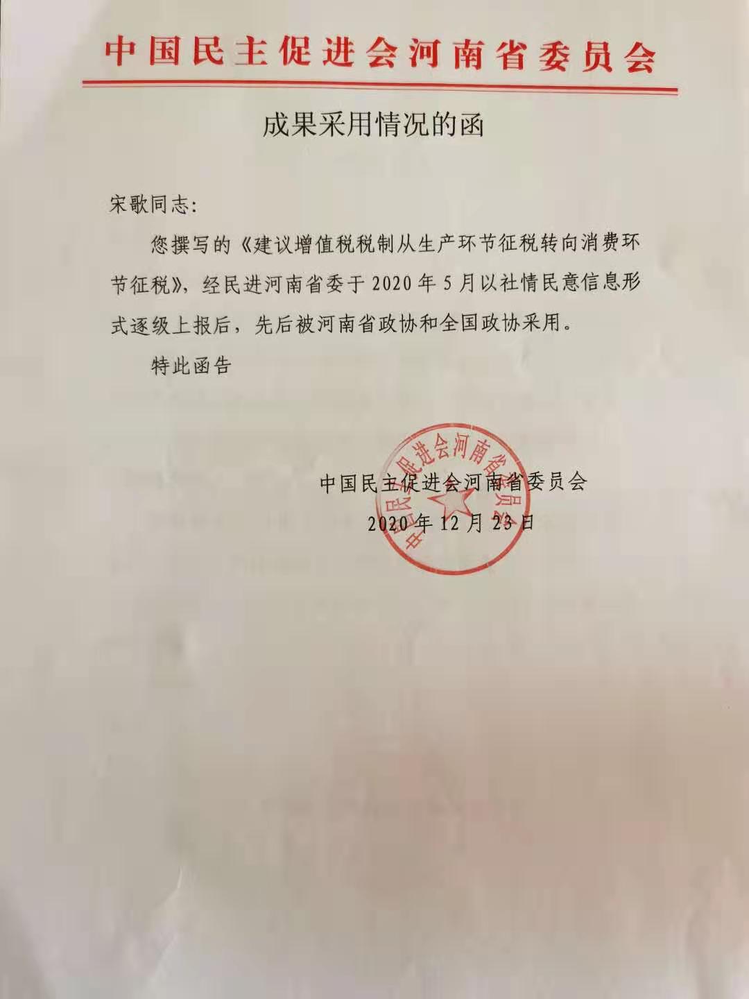 近日,从民进河南省委传来消息,世界杯体育官方网站民进会员宋歌老师撰写的《建议增值税制从生产环节征税转向消费环节征税》得到了全国政协和河南省政协共同采用。