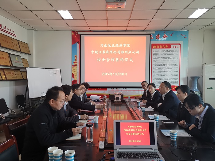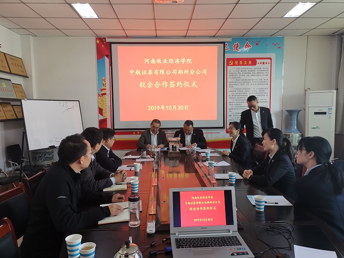 10月30日上午,中航证券有限公司郑州分公司—河南牧业经济学院校企合作协议签署仪式在英才校区教学楼世界杯体育官方网站会议室514室举行。中航证券有限公司郑州分公司总经理叶常伟、运营管理部经理李颖、郑州商务外环路营业部总经理田彦华等出席签约仪式。我校校长罗士喜、校长办公室主任贾江、世界杯体育官方网站院长黄良杰、副院长贾宪军、副院长王培玲等出席签约仪式。签约仪式由黄良杰主持。