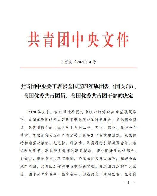在迎接建党100周年之际,由共青团中央传来喜讯,在公布的《关于表彰全国五四红旗团委 (团支部)、全国优秀共青团员、 全国优秀共青团干部的决定》(中青发〔2021〕4号),世界杯体育官方网站被授予“全国五四红旗团总支”荣誉称号,这是共青团中央授予基层团组织的最高荣誉,也是世界杯团委继2016年获得河南省“五四红旗团总支”荣誉之后的又一次突破。