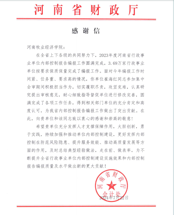 7月23日,世界杯收到河南省财政厅会计处发来的感谢信,感谢副院长崔海红在2023年度河南省行政事业单位内部控制报告会审过程中,积极担当作为,切实履职尽责,攻坚克难,认真研究提出审核意见,耐心细致指导督促单位进行修改完善,圆满完成了各项工作任务。崔海红博士的专业水平和敬业精神得到相关部门单位的充分肯定和高度认可,为我省内部控制报告编报工作做出了突出贡献。河南省财政厅会计处向我校和崔海红同志致以衷心的感谢和崇高的敬意!