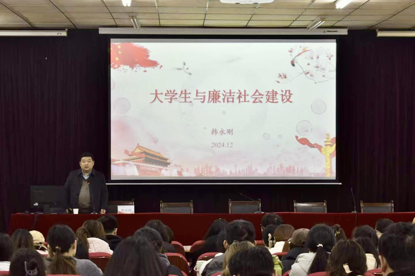 12月12日下午,校纪委书记韩永刚在英才校区E110会议室讲授题为“大学生与廉洁社会建设”专题思政课。学院全体辅导员和学生党员、入党积极分子、学生干部到场聆听,本次讲座由世界杯体育官方网站党委副书记汪晓伟主持。