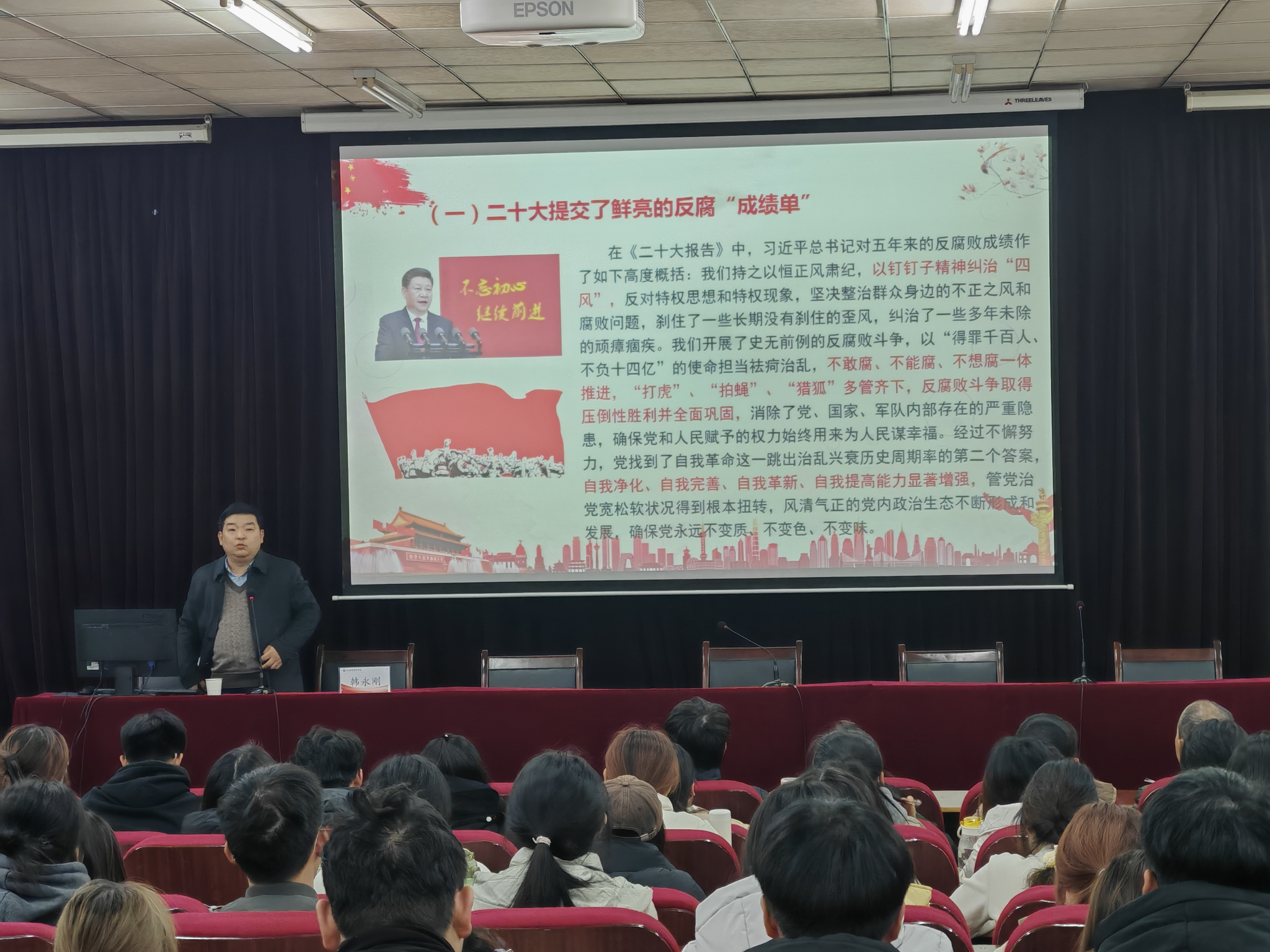 本次专题思政课,韩永刚书记以学习领会党的二十大、党的二十届三中全会精神关于党风廉政建设和反腐败斗争的新论断开篇,用大量详实的数据和实例回顾了党的十八大以来我党全面从严治党的坚定决心和反腐败斗争取得的成效。接着,韩书记讲授了对学生党员干部进行廉洁教育的重要意义,结合纪检监察工作实际就大学生如何做到廉洁修身指明了努力方向。他要求,要以习近平新时代中国特色社会主义思想和党的二十届三中全会精神为指导,以积极认真的态度和务实有效的行动组织开展好大学生廉洁文化教育活动,使廉洁文化真正入耳入脑入心,让廉洁教育结出丰硕成果。
