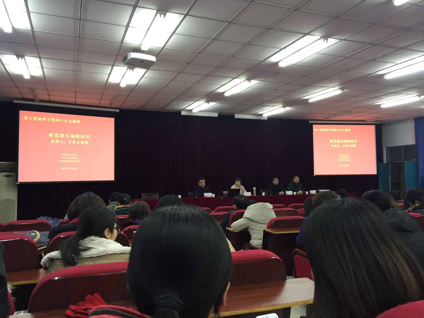 宣讲报告结束后,胡红林书记代表三个学院对王教授的精彩宣讲表示感谢,同时对下一步十九大精神学习贯彻提出明确要求:一是学习贯彻十九大精神是当前和今后一个时期的首要政治任务,思想上要高度重视;二是大家要主动深入的学习十九大精神,用习近平新时代中国特色社会主义思想武装头脑;三要在联系实际上下功夫,用十九大精神指导工作,以实际行动为学校事业发展做出更大的贡献。