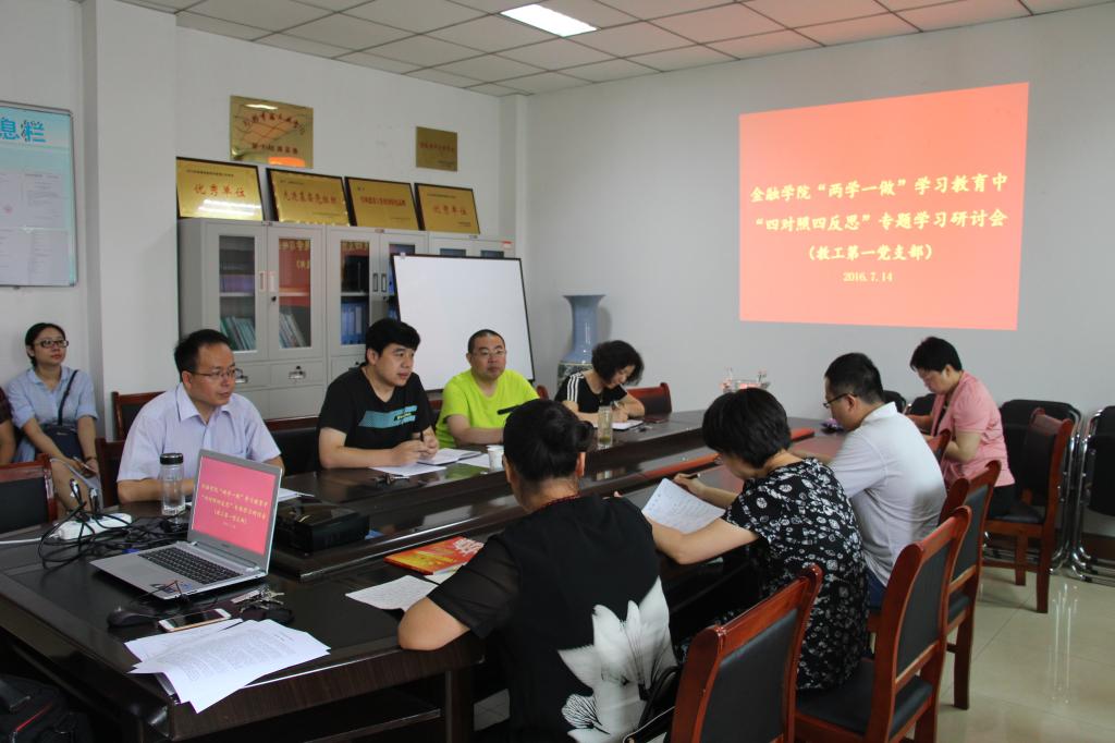 根据我校《关于在“两学一做”学习教育中围绕“四对照四反思”认真组织开展专题学习讨论的通知》要求,金融学院于7月14日上午在教学楼514会议室召开“四对照四反思”专题学习研讨会,全体党员老师参加了会议,会议由党总支书记席波主持。