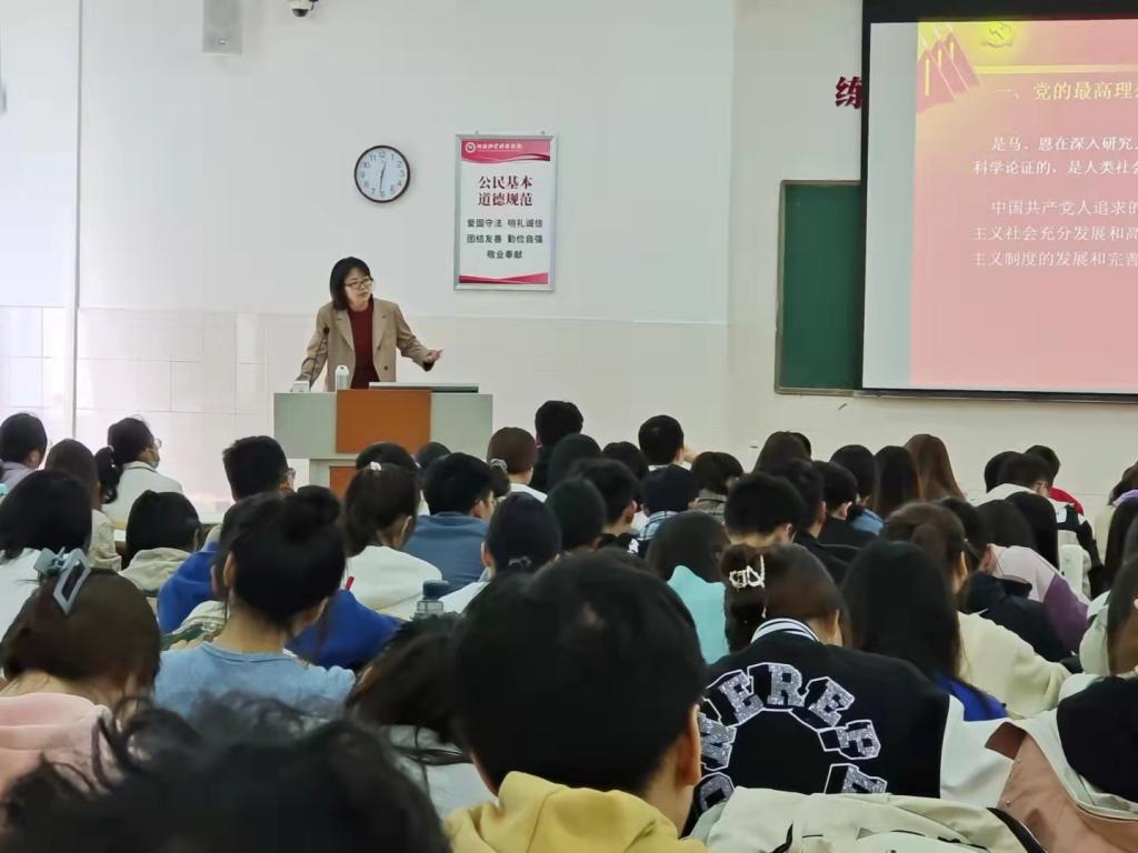 培训课上,刘老师就党的最高理想和最终奋斗目标是实现共产主义、党在现阶段奋斗目标是坚持中国特色社会主义道路和开启全面建设社会主义现代化国家新征程等三大方面为学员们进行讲解。首先,刘老师讲述了中国共产党的最高理想是实现共产主义,向学员们表达了社会主义制度的优越性,讲到这里她激动又骄傲,同学们更是听得聚精会神。接着,刘老师又从党现阶段的奋斗目标和社会主义初级阶段的基本路线两个方面展开讲述了中国共产党在各个历史阶段奋斗目标的演变,要求同学们要增强“四个意识”、坚定“四个自信”、做到“两个维护”。最后,刘老师强调广大青年和大学生应坚定跟党走,做共产主义远大理想和中国特色社会主义共同理想的信仰者,青年兴则国家兴,青年强则国家强,每位入党积极分子都要在今后的生活中严于律己,为把我国建设成为富强、民主、文明、和谐、美丽的社会主义现代化强国而努力奋斗。