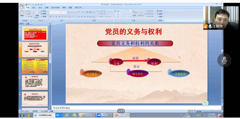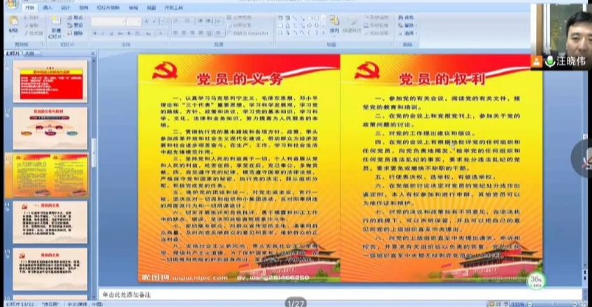 为进一步提高入党积极分子的政治理论水平,强化基本素养,提高党员发展工作的质量,严把党员发展的入口关。2022年3月28日晚上,世界杯体育官方网站通过腾讯会议线上开展了“2022年第一期入党积极分子培训班”第四讲,党课主题为《共产党员的条件、义务和权利》,本次党课由世界杯体育官方网站党委副书记汪晓伟老师主讲。