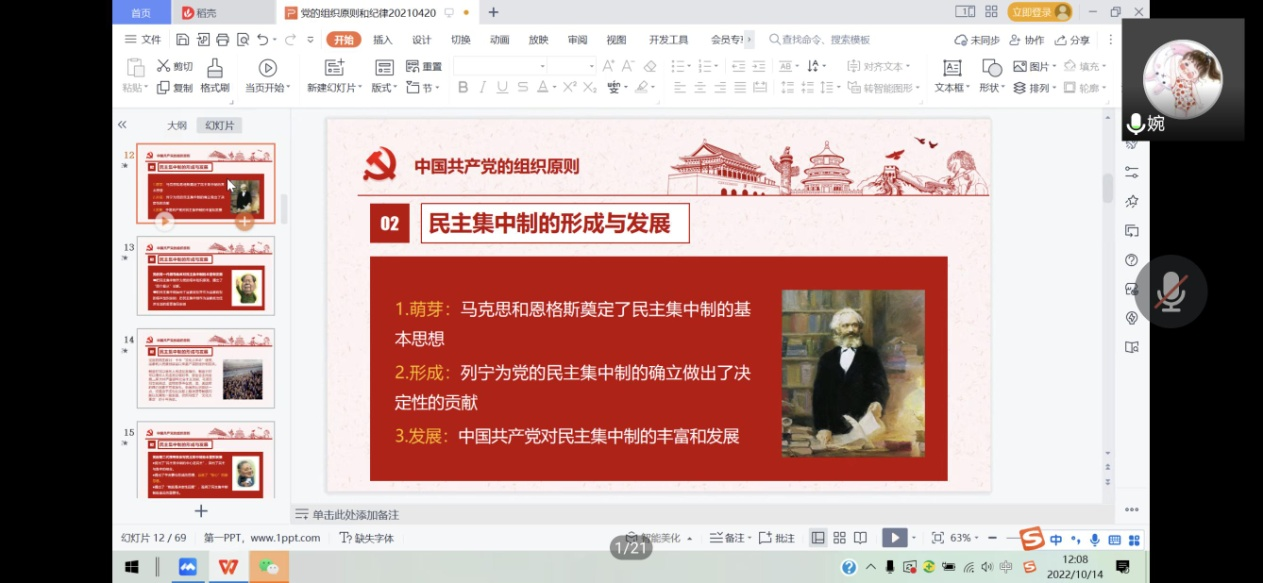 10月14日中午,世界杯体育官方网站在线上开展了2022年第二期入党积极分子培训班第七讲,党课主题为《党的组织原则、纪律和作风》,本次党课由世界杯体育官方网站学生第二党支部书记葛婉老师主讲。