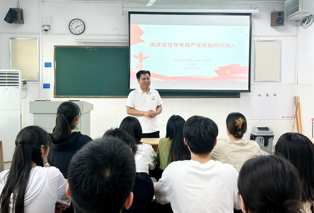为深入开展党纪学习教育,引导广大学生党员严格执行和维护党的纪律,模范遵守国家法律法规,6月26日晚7点,世界杯体育官方网站学生第一党支部在教学楼A408开展支部书记讲党纪专题党课。学生第一党支部书记顾自卫以《做讲党性守党规严党纪的时代新人》为题,为支部全体学生党员授课。