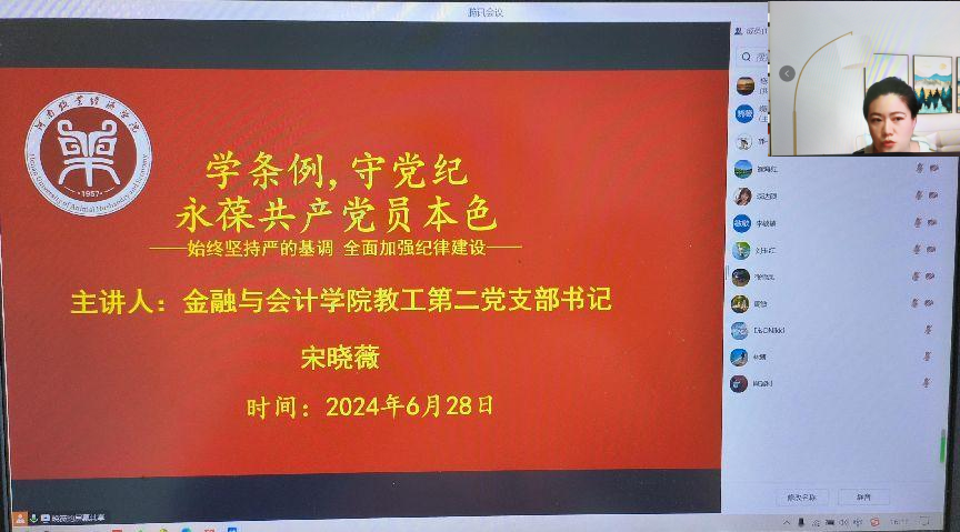为提升党员同志的党性修养和纪律意识,在学校学院党委关于开展党纪学习教育的部署要求指导下,6月28日世界杯体育官方网站教工第二党支部书记宋晓薇以《学条例,守党纪,永葆共产党员本色》为主题讲授了党纪学习教育专题党课,教工第二支部的党员干部和党员教师参加党课学习和研讨。