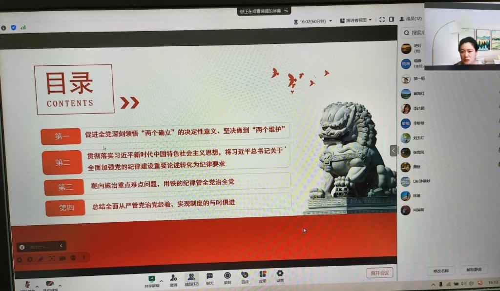 支部书记宋晓薇在党课上首先介绍了本次党课的主要内容和安排,并从四个方面开展党课的讲解论述,主要包括,第一,深刻领悟“两个确立”的决定性意义、坚决做到“两个维护”;第二,贯彻落实党纪党规等纪律要求,自觉形成遵规守纪的高度自觉性和日常习惯;第三,针对靶向施治的重点难点问题进行剖析,让党员干部同事们重视、警醒、知止;第四,《中国共产党纪律处分条例》是全面从严管党治党的最新实践总结,赋予了制度与时俱进的生命力。宋晓薇围绕《中国共产党纪律处分条例》(以下简称《条例》)的三次修订历程,以及《条例》增写、修订和完善的内容重点展开论述,围绕“六项纪律”并结合专业进行了阐释。之后,本支部党员领导老师针对本次党课开展了讨论研讨,郭一恒老师针对本次党课开展了心得体会进行了交流发言。