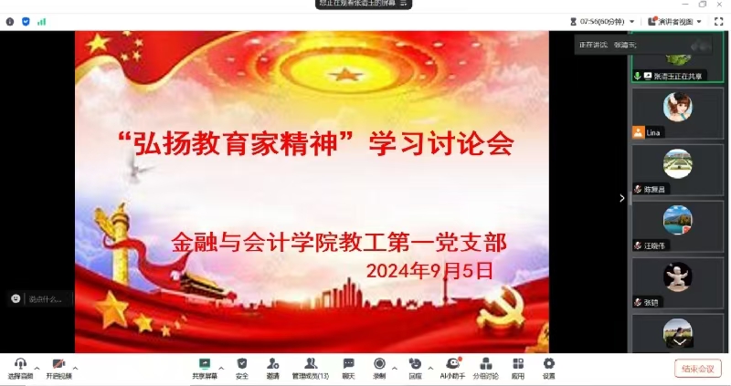 为了大力弘扬教育家精神,加强新时代高素质专业化教师队伍建设,按照学校党委的统一要求,2024年9月5日下午,世界杯体育官方网站教工第一党支部召开专题学习讨论会,集体学习中共中央、国务院以及学校相关文件精神,研讨如何在日常教育教学中践行教育家精神。会议由支部书记张清玉主持,教工一支部全体党员参加会议。