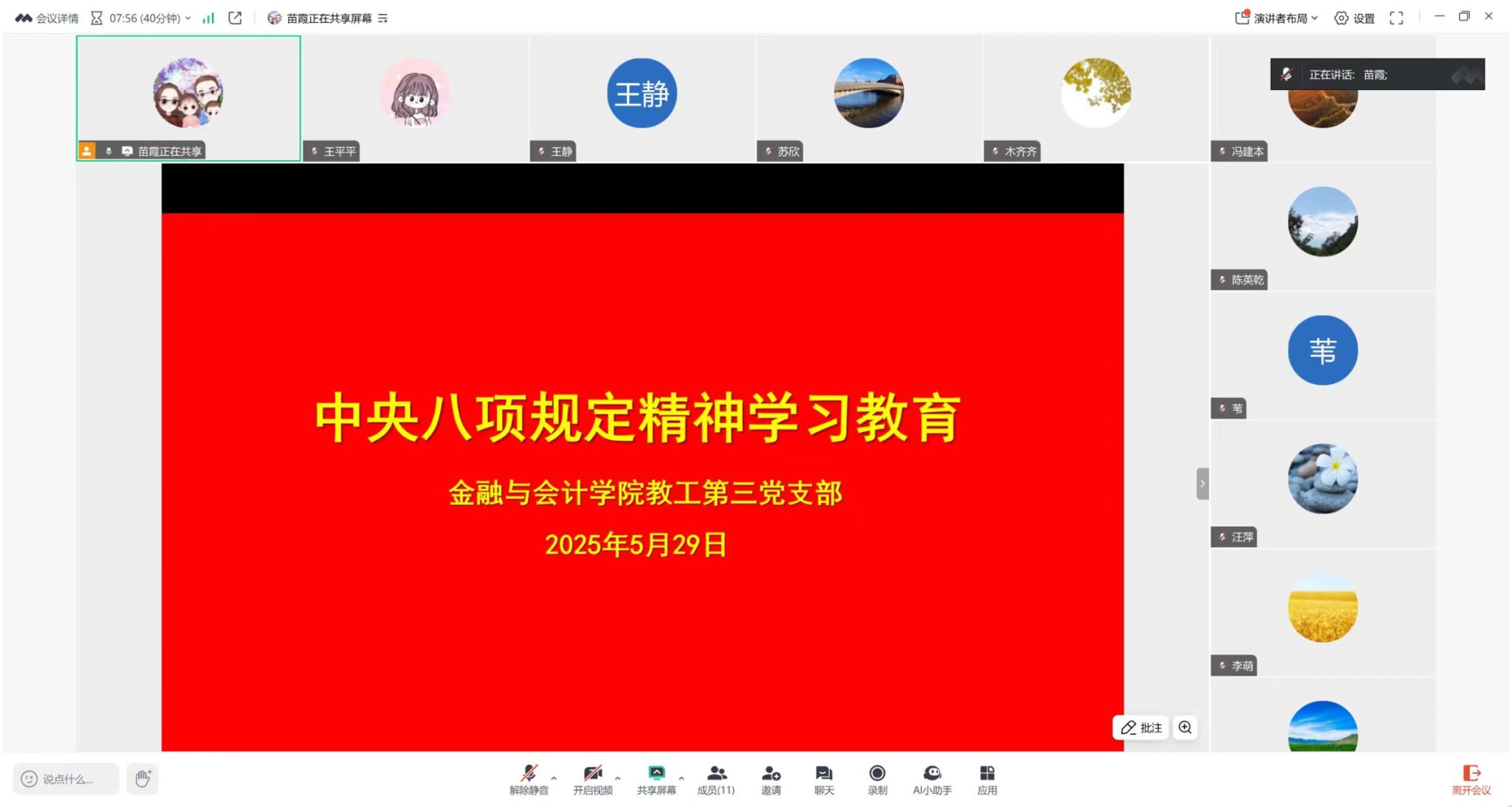 2025年5月29日,世界杯体育官方网站教工第三党支部以线上会议形式召开深入贯彻中央八项规定及其实施细则精神学习教育交流会。会议由教工第三党支部书记苗霞同志主持,支部全体党员参加会议。
