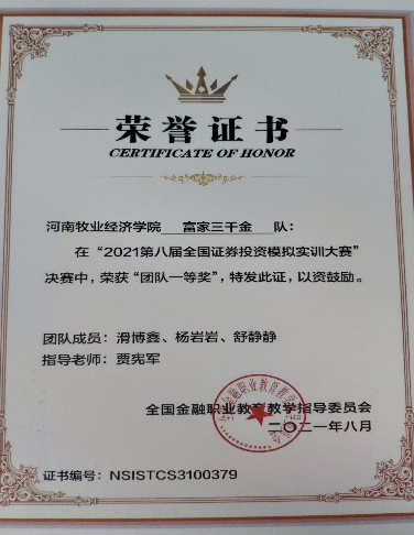本次大赛共有来自全国589所院校,21046支队伍,65673人参赛。比赛历时3个月,从报名阶段开始院领导就高度重视,副院长贾宪军带队,选拔出186名学生及9名教师,组成52个团队参赛。3个月以来,历经了学生动员培训会、教师多次精心指导、学生不断优化策略、突围区域选拔赛、挺进决赛,最终把握大势、精准交易、强化风险,获得了一个团体一等奖、四个团体二等奖、六个团体三等奖,以及五个个人一等奖和二等奖,创世界杯参赛以来的最好成绩。