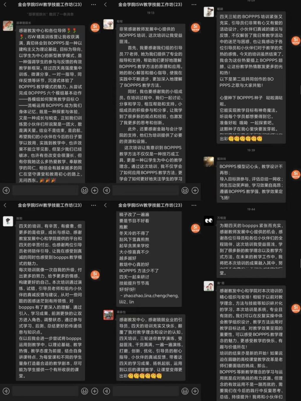 此次培训采用小班研讨,体验式学习的学习方式,通过4天密集体验式学习,通过三次完整的教案单撰写、微课演练、一对一引导和团队互评环节,将BOPPPS理论与实践有机高效融合。在约30小时的研习课程中,由专家引领,学习者在相互支持中彼此呈现迷你教学,不断复习教学模组设计、不断拆解反思教学行为、不断尝试新的教学策略及教学技巧,进而提升教学水平。