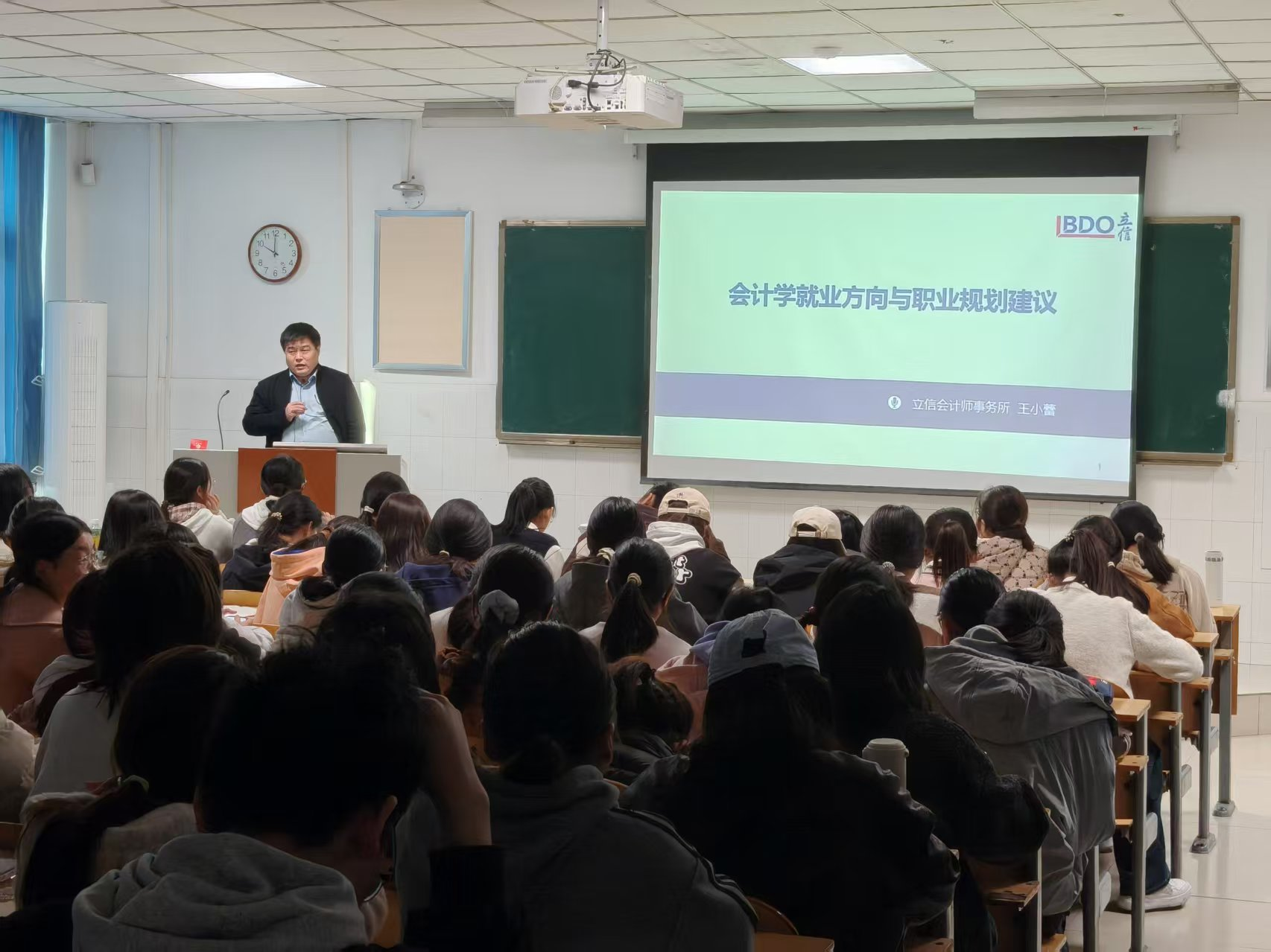为深化产教融合,加强校企合作,引导新生科学规划职业发展,11月12日,作为立信会计师事务所的权益合伙人王小蕾应邀走进课堂,为2025级会计学及会计学(注册会计师方向)专业的新生,带来了一场主题为“会计学就业方向与职业规划建议”的专题讲座。王小蕾围绕会计专业的多元就业路径、职业能力要求、行业发展趋势以及大学期间的学业规划等核心内容展开讲解。他结合自身职业成长经历,详细解读了企业财务、会计师事务所、金融机构、政府与非营利组织等不同方向的职业特点与发展空间,特别针对注册会计师的职业前景进行了深入剖析。