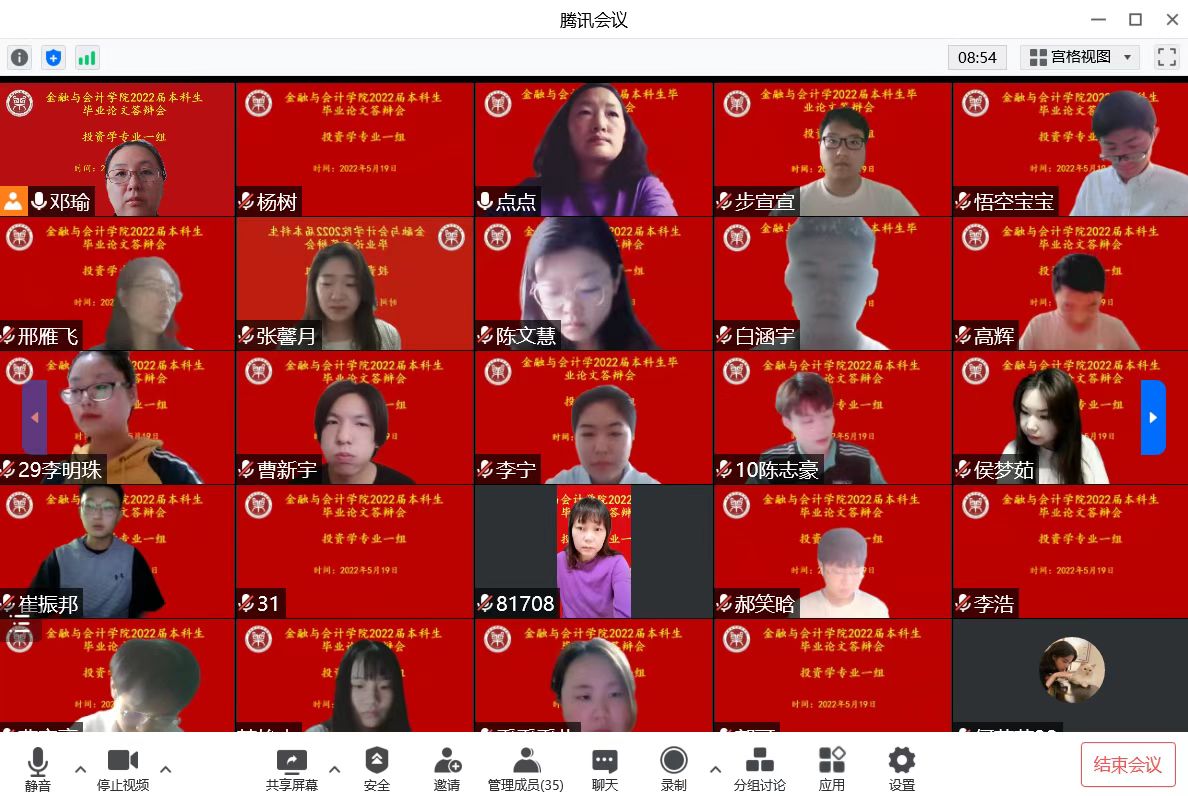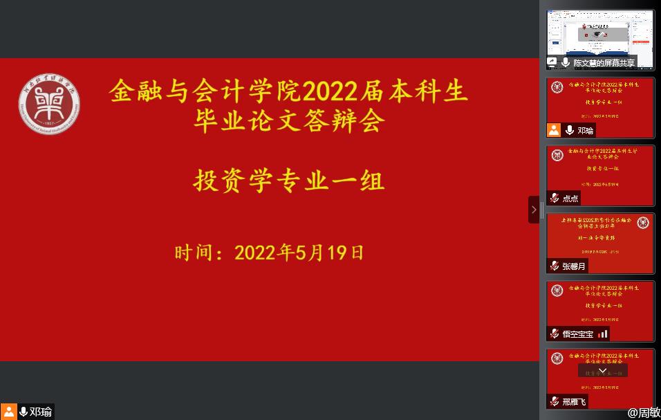 2022年5月16-19日,根据疫情防控工作相关要求,世界杯体育官方网站投资学专业通过腾讯会议组织了2022届本科生毕业论文(设计)第一次线上答辩。