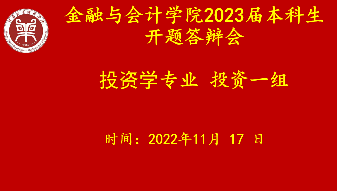 根据《河南牧业经济学院本科毕业论文(设计)工作条例》和《世界杯体育官方网站2023届本科毕业论文工作实施方案》的要求,世界杯2023届投资学本科专业毕业论文开题答辩工作,于11月17日通过腾讯会议线上顺利进行,本次答辩分为2个答辩组,共99名学生、12名指导教师参与答辩会。