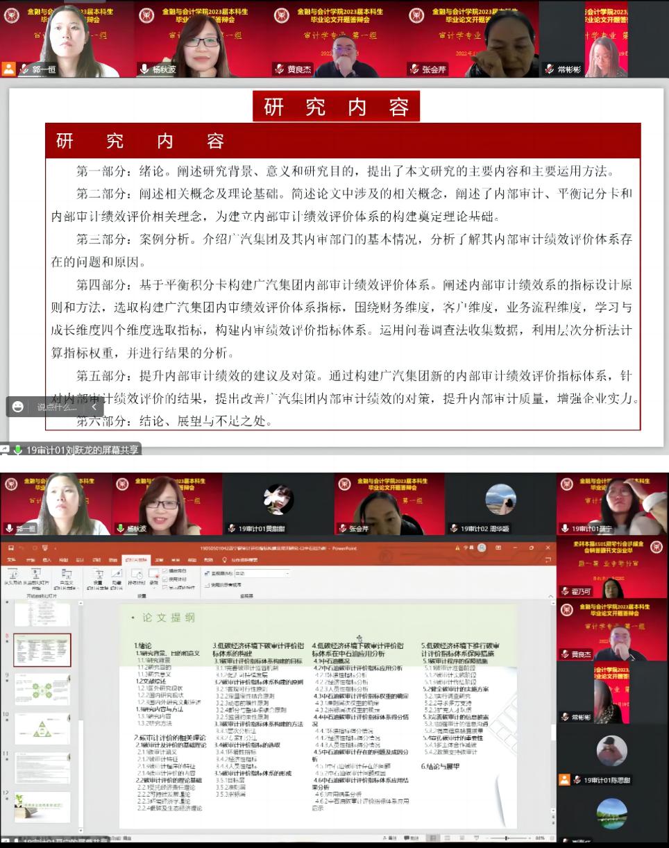根据《河南牧业经济学院本科毕业论文(设计)工作条例》和《世界杯体育官方网站2023届本科毕业论文工作实施方案》的要求,世界杯体育官方网站2023届审计学专业本科毕业论文开题答辩于2022年11月19日8:00在英才校区举行,由于疫情的原因,答辩采取线上的形式举行,共分2个答辩小组,审计学专业118名同学参加了开题答辩。
