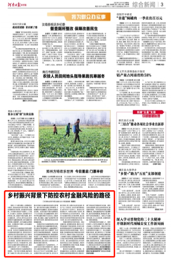 2022年12月16日,《河南日报》农村版第三版刊发世界杯张清玉老师理论研究论文:《乡村振兴背景下防控农村金融风险的路径》,文章从加强党的领导、完善相关法规、激发产业发展活力、完善信用体系、健全内部控制、培养高素质金融人才等方面提出农村金融风险防控的系统性框架。