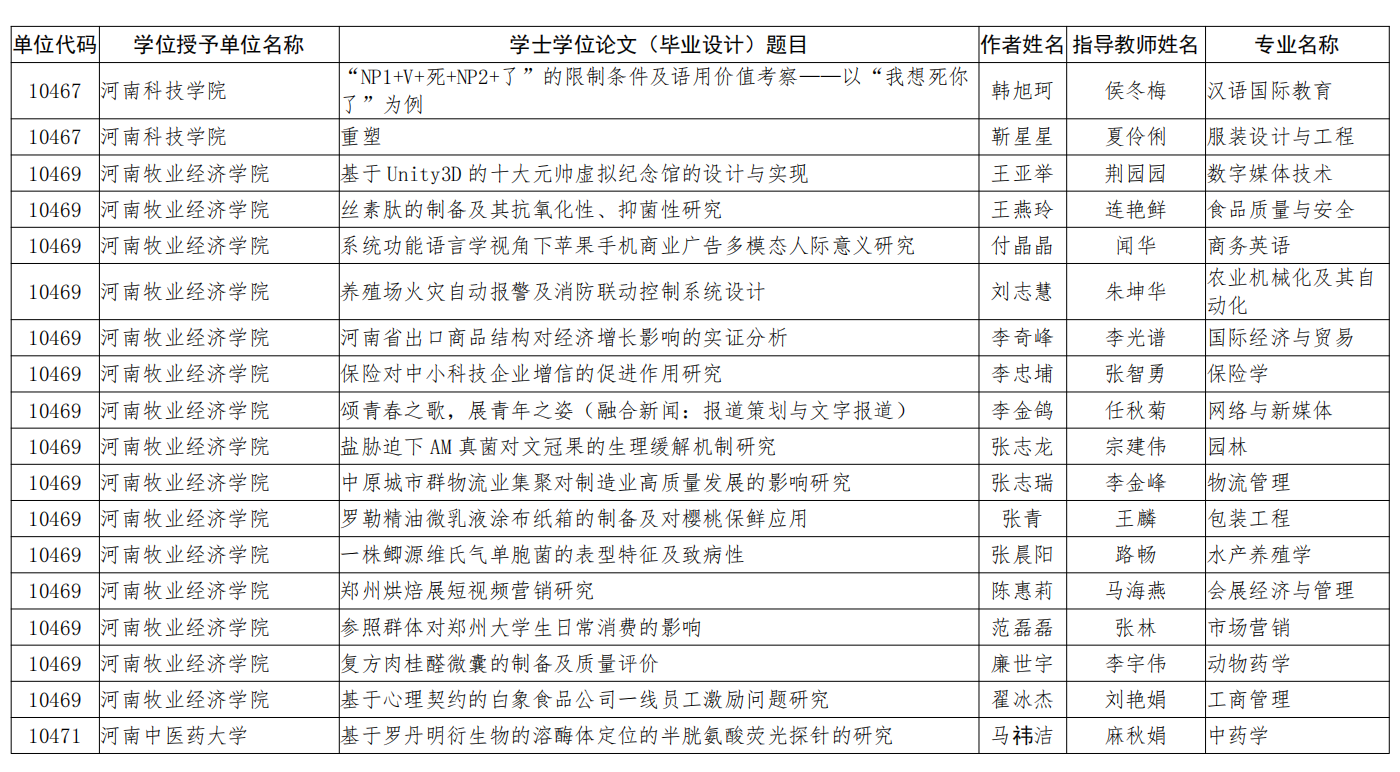 近日,河南省教育厅、河南省学位委员会发布了《河南省教育厅河南省学位委员会关于批准2022年河南省优秀学位论文的决定》(教研〔2023〕310号),文件公布了2022年河南省优秀学位论文的评选结果,世界杯体育官方网站保险学教研室张智勇老师指导的毕业论文《保险对中小科技企业增信的促进作用研究》被评为2022年河南省优秀学士学位论文。这是世界杯张智勇老师连续两年在河南省优秀学位论文评选中获得佳绩。