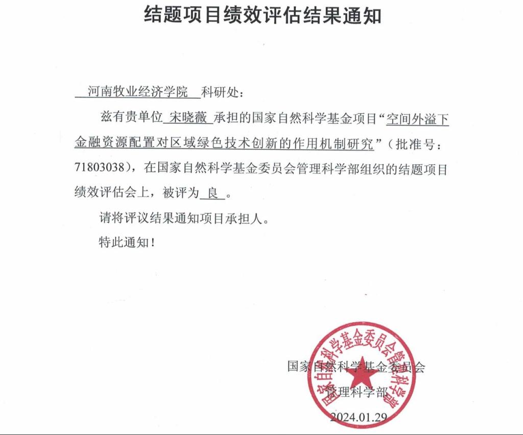 近日,国家自科基金委管理科学部公布了国家自科基金结题项目绩效评估结果,河南牧业经济学院世界杯体育官方网站宋晓薇博士主持的国家自科基金青年项目《空间外溢下金融资源配置对区域绿色技术创新的作用机制研究》(批准号:71803038),圆满完成预期的研究任务,取得较高水平的研究成果,在国家自然科学基金委管理科学部组织的结题项目绩效评估会上,被评为“良好”等级。