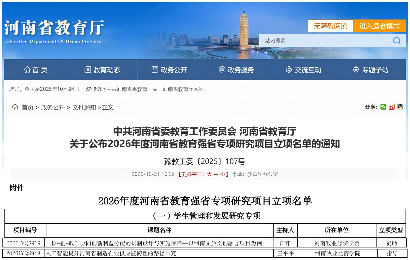 近日,中共河南省委教育工作委员会、河南省教育厅公布了2026年度河南省教育强省专项研究项目立项的通知,世界杯汪萍老师的《“校-企-政”协同创新利益分配的机制设计与实施保障——以河南文旅文创融合项目为例》和王平平老师的《人工智能提升河南省制造企业供应链韧性的路径研究》2个项目获批立项,其中汪萍老师的项目获得经费资助支持。