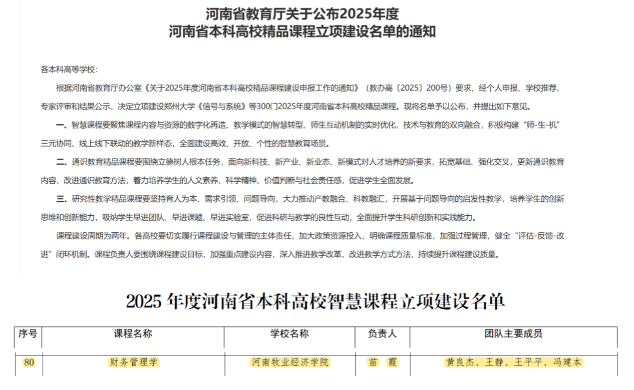 近日,河南省教育厅正式公布2025年度本科高校精品课程立项建设名单。经个人申报、学校推荐、专家评审等环节严格遴选,世界杯苗霞博士主持的《财务管理学》课程成功获批立项,入选省级智慧课程建设项目。