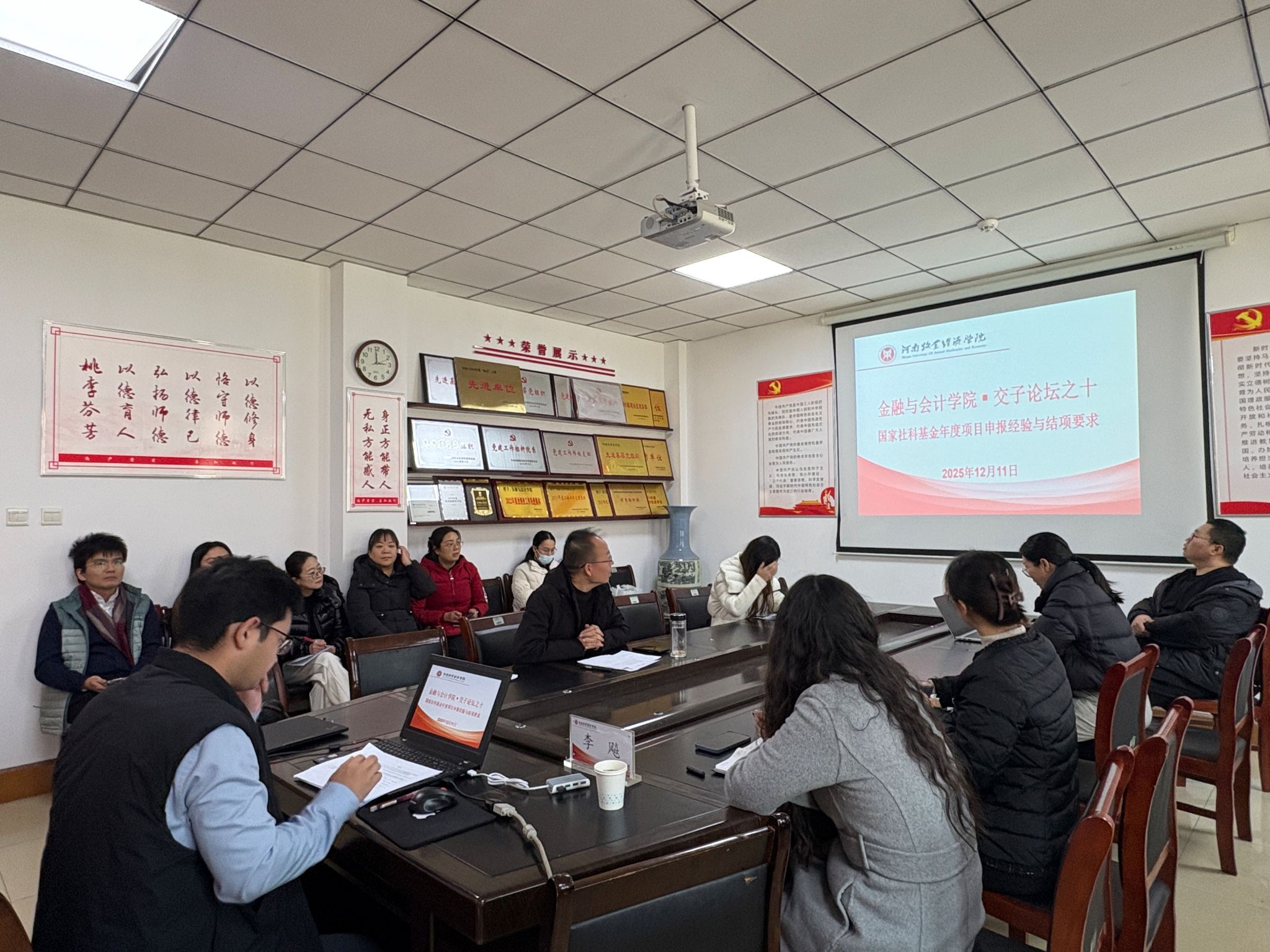2025年12月11日下午,金融与会计学院在教学楼514会议室举办国家社科基金申报专题指导讲座,特邀郑州大学商学院李飚教授担任主讲,围绕“国家社科基金申报、执行与结题”开展系统讲解,并对学院教师的申报课题进行现场点评与指导。学院博士、部分教师及兄弟学院教师参加了此次讲座,讲座由世界杯体育官方网站院长贾宪军教授主持。