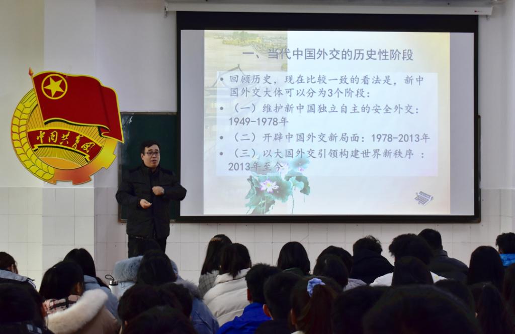 培训伊始,陈老师简明扼要的总括了中国外交史的风雨历程,阐述了当代中国外交的政策方针对于维护世界和平、推动人类事业进步所具有的重大理论意义和实践价值。接着,陈老师从“当代中国外交的历史性阶段”、“当代中国外交的主要成就”和“当代中国外交的经验与启示”三个方面分别阐释了自新中国成立初期至全面建成社会主义现代化国家这一阶段中国外交的战略与局面。他从世界格局的发展角度为同学们讲述了中苏关系、中美关系及与其他各国的关系。最后,陈老师指出,当今中国正以负责任的强国形象引领世界发展,正带着开放与包容走向世界舞台中央。因此,我们青年学子应把握时机,顺势而为,不虚度大好年华,为祖国发展贡献自己的青春力量。