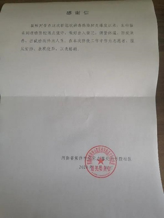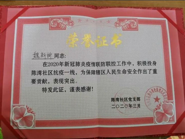 在社区工作中,魏新柳感到防疫抗疫工作虽繁琐复杂,但只要抱着不惧疫情、砥砺前行的信念,任何困难都不是困难!社区里的党员干部哪个不是脚不点地从早忙到深夜,学校里的校友师生都在自己的防疫岗位上,勤勤恳恳工作,兢兢业业地奉献。作为其中一名光荣的共青团员魏新柳很自豪。春已至,花会开,相信只要大家坚定信心,万众一心,就一定能度过难关,一定能打赢这场疫情防控阻击战!
