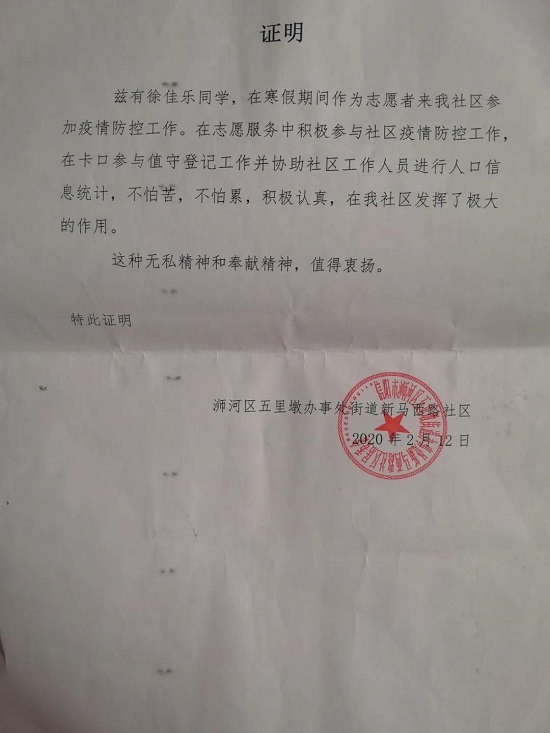 全国各地的抗疫行动拉开了序幕,徐佳乐很荣幸以志愿者的身份参与了此次防疫工作。当疫情来临之时,84岁的钟南山临危受命,冲锋于疫情之间,为民情战,百衣挂帅,国士无双。若有战,召必回,战必胜。请战书上的手印,记载着太多人的满满深情。在大灾大难面前,他们仍然义无反顾的往前冲,用自己生死未卜,守护整个中华。位卑未敢忘忧国,身为大学生的我们,更应如此,为国分忧。