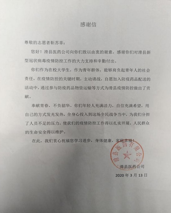 本次疫情期间,世界杯学生靳苏菲很荣幸自己能够作为志愿者为本次疫情贡献自己的一份力量。此次疫情的志愿工作主要是参与防疫药品物资运输与配送,这次活动,让她了解到志愿服务活动培养她的不仅仅是一种精神,更是培养了自己的极限和耐力,同时也看到自己的潜力。每当感到疲惫的时候,想想战疫前线的白衣战士,想想值岗值班的公安卫士,想想临危不惧的社区勇士,想想身边和她并肩作战的志愿者们,期待如李贺曾在诗中所道“寒风又变为春柳,条条看即烟濛濛”,期待冬天快点过去,期待春天快点到来,期待疫情早日散去,祖国无恙,你我皆安,人间充满爱与希望,想到这里也就不会感到那么累了。