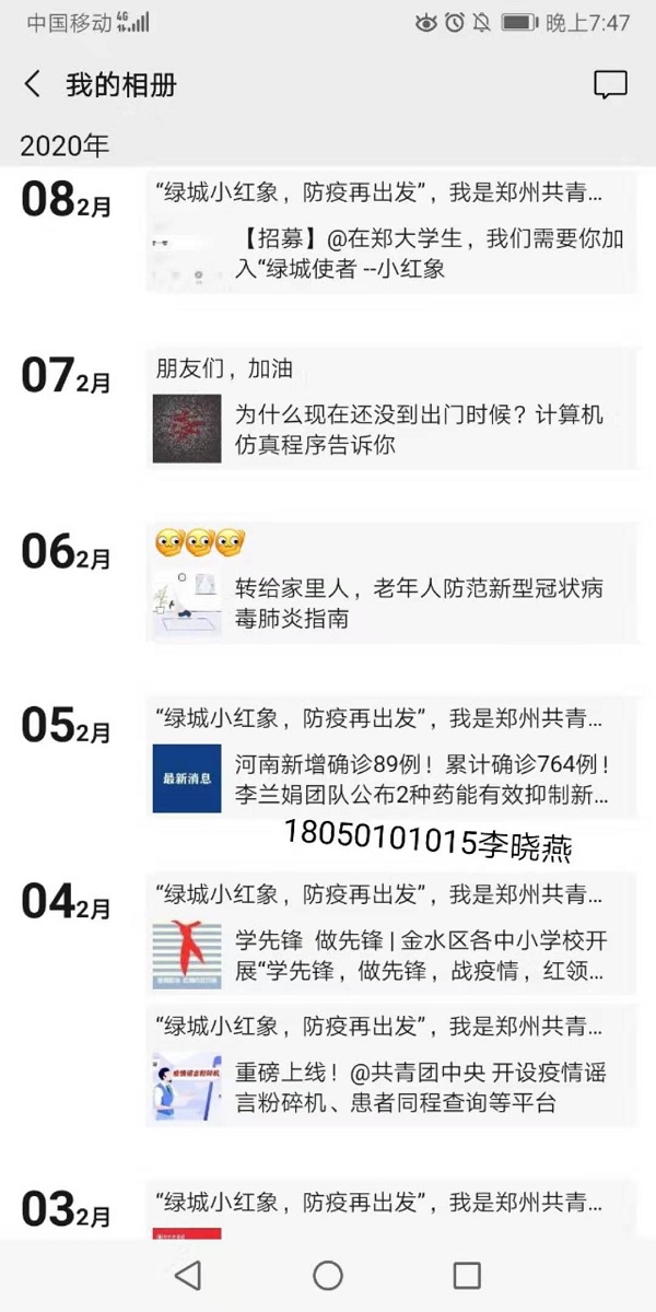 18级财务管理一班的张瑞静和李晓燕,在假期期间参与了青年志愿者协会,并且组成了环手爱疫情防控小分队。自一月份至如今,在郑州共青团的指示下,她们每天线上向人们宣传相关疫情知识与防控等。志愿者们足不出户一方面宣传了疫情,另一方面避免了感染的风险。她们的初衷是:全心全意为人民服务,为这次疫情的防控起到积极向上的作用,用实际行动告诉大家,只要中国人民团结一心,任何困难都将会被克服。