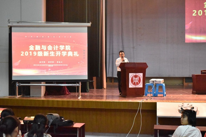 开学典礼在全场庄严的奏唱国歌声中拉开帷幕。世界杯体育官方网站院长黄良杰首先代表全院教师表达了对新生的诚挚欢迎。他向新生介绍了院史和校情,并指出同学们要以“明德立信、格物至善”的院训为指引,以青春岁月换得良好的品德、丰富的知识,在大学中获得真挚的友情和健康的体魄,让学校成为同学们内心深处的精神家园。谈话中,他还从做人、做事、养成学习的习惯和能力三个方面对新生提出要求:一是希望新生在今后大学的学习生活中,学会做人做事,要遵守职业操守、职业道德。通过案例的分享,强调同学们在大学树立起正确的价值观、人生观和事业观。二是希望同学们能够做好学习计划与总结,致力养成终身学习的行为习惯和逻辑思考能力。他以自身专业角度出发,向同学们介绍了有关考研以及考取证书的相关信息,并以当前在校生学习现状为例,强调自身学习规划的重要性,激发同学们的学习热情。三是希望同学们能够经常与父母保持联系,注重家庭与学校生活的和谐共处,并强调同学们在校期间注意财产与自身安全,顺利度过大学四年的学习生涯。