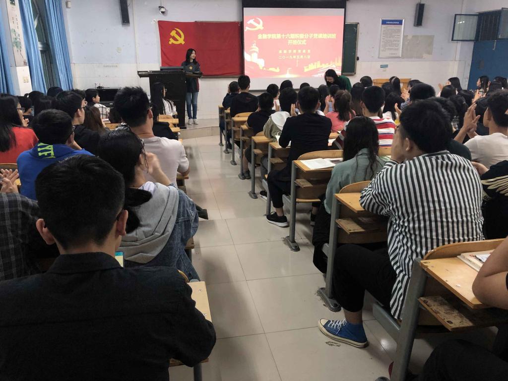 为提高大学生的党性修养,端正入党动机,保持党的先进性、纯洁性,落实党内政策,做好党员的发展工作,2019年5月8日晚上19:00点,我校金融学院分党校第十六期积极分子培训班在教学楼W202正式开始。金融学院党总支书记胡红林、正处级组织员赵桂珍及全体辅导员老师出席开班仪式,仪式由团总支书记李特主持。
