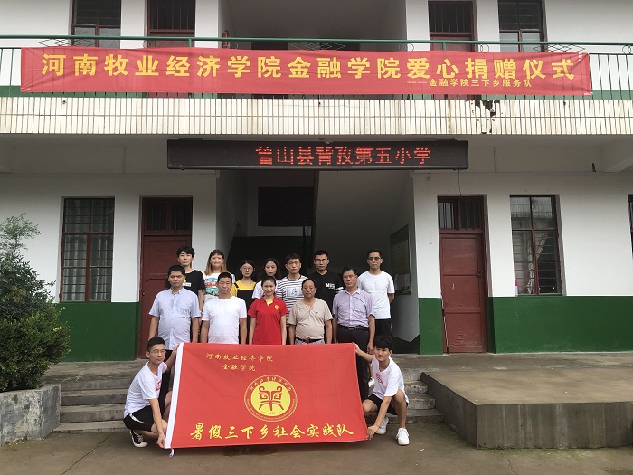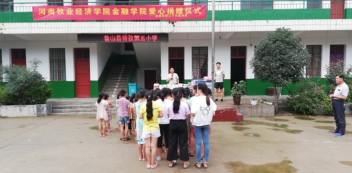 7月14日上午8:00,“向阳花”社会实践服务队在鲁山县背孜乡盐店村第五小学开始布置捐赠仪式现场,上午9:00捐赠仪式正式开始。鲁山县纪委驻村第一书记、背孜乡纪检书记、盐店村党支部书记、小学校长、老师代表以及小学生们参加了捐赠仪式。