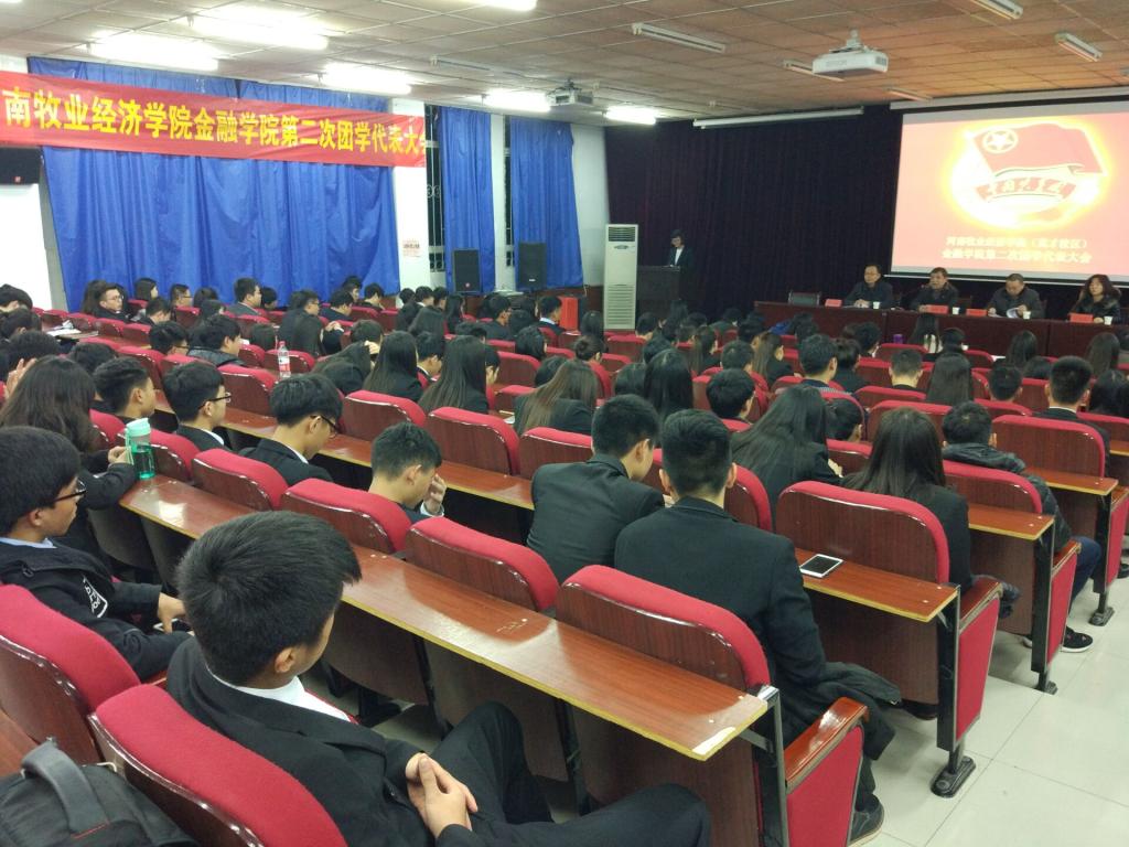 11月28日,河南牧业经济学院金融学院第二次团学代会于在E110隆重召开。金融学院党总支书记胡红林、院长黄良杰、副书记兼副院长贾宪军、副院长王培玲、兄弟院系团总支书记和一百一十七名团、学代表参加大会。