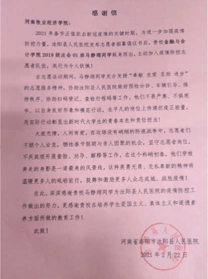 近日,我校收到洛阳市汝阳县人民医院发来的感谢信,信中对世界杯学子马静翊在春节期间积极投身疫情防控工作中的突出表现表示感谢。