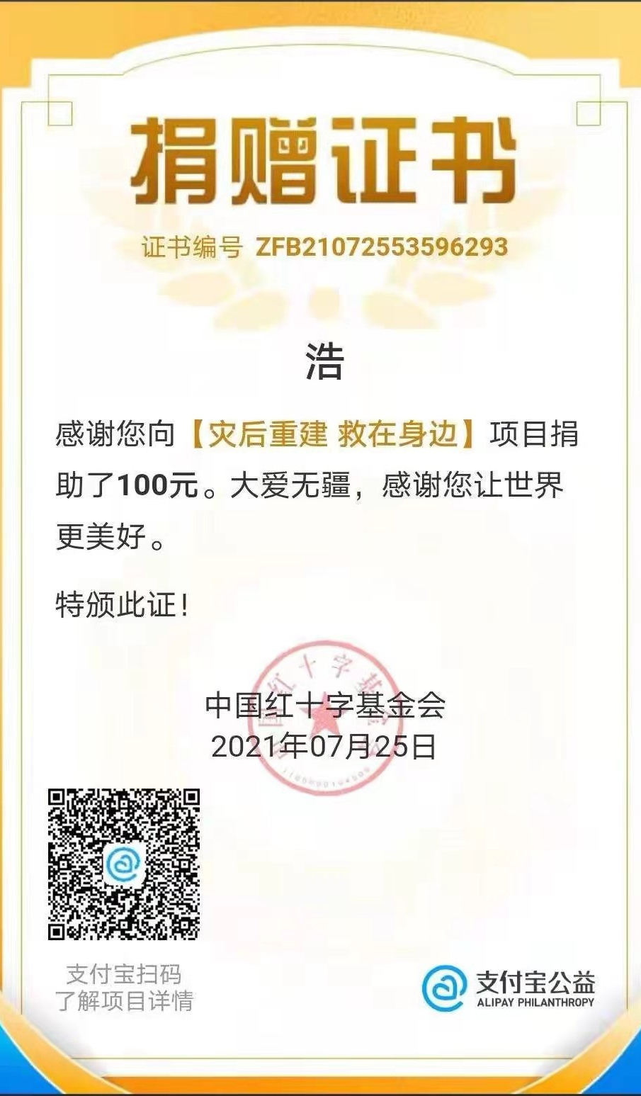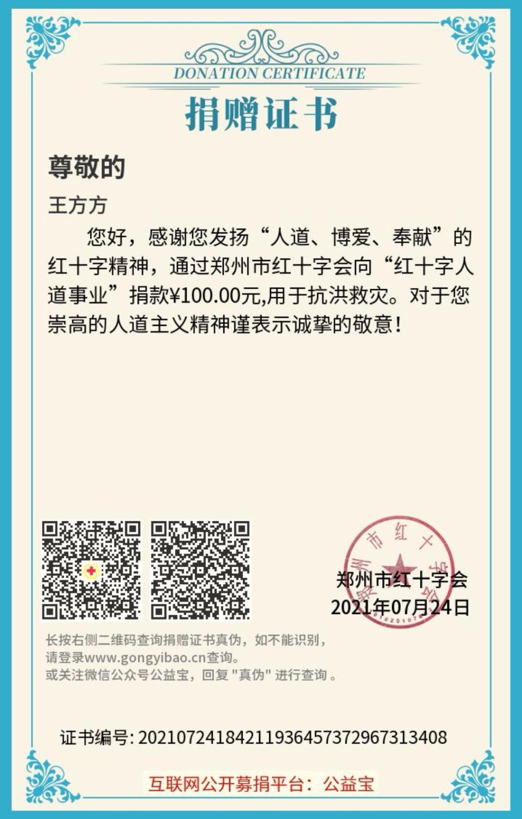 在郑州“7.20”特大洪水中,她积极参加管城区南关街志愿活动,为抗灾救援贡献自己的一份力量。在管城区南关街共青团委老师的指导下,她跟随志愿者团队帮助社区群众整理街道垃圾并宣传灾后传染病、疫情防控知识;前往银基、大观国贸商城,搬卸送往郑州的各地救援物资。在这次志愿活动中,她竭尽全力,积极参与志愿服务活动之中。她也表示:青年大学生肩上有自己需要扛的责任,请祖国放心,强国有我,在今后的学习生活中,竭尽所能贡献自己的青春,将一腔热血投入到社会服务中,不负人民,不负社会,不负国家!