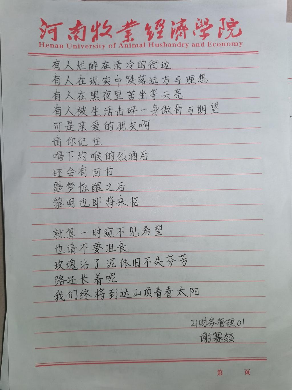 中国书法,字里千秋。为提高学生们的艺术修养与审美情趣,弘扬中华优秀书法文化,世界杯体育官方网站心教部于十月二十九日推出为期三天的“关爱心灵,秀出自己”线下活动。此次活动面向世界杯全体学生,在同学们一幅幅气韵贯通的书法作品中,我们深切地感受到了他们昂扬向上的斗志与积极乐观的人生态度。