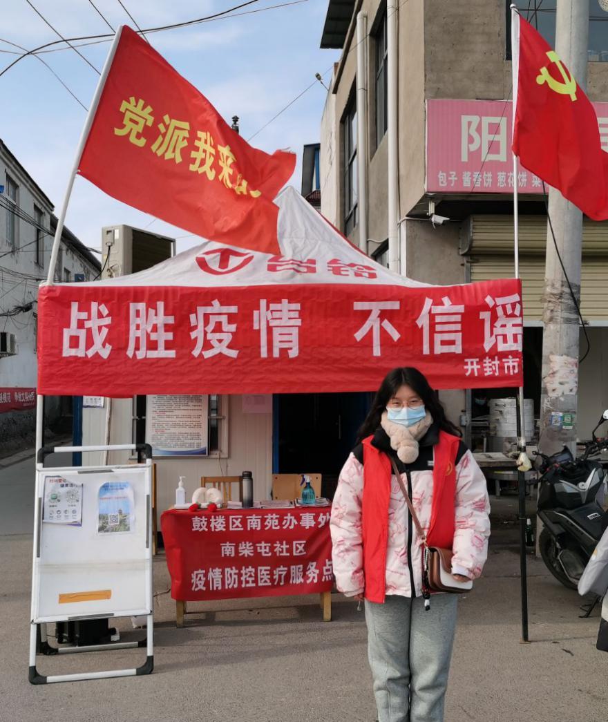 疫情就是命令,防控就是责任。冯烁同学家在河南省固始县秀水街道二里井社区,她积极响应国家号召参与抗疫志愿活动,配合街道维持核酸检测点的秩序,做好流行病学调查,进入小区挨家挨户排查居民核酸检测情况,针对孕妇、老人、儿童等外出不方便的居民进行登记,方便后续医护人员上门采集,宣传讲解政策和疫情防控的重要性,更好地配合社区各项工作。工作期间, 她真切地感受到了医护人员的伟大,很荣幸能够同他们并肩作战,为社会贡献绵薄之力。冯烁同学表示: 疫情无情人有情 ,面对疫情,我们从来都不是局外人。作为新时代的青年,更应该用实际行动展现自己的精神面貌,为社会做出自我应尽的义务和贡献。