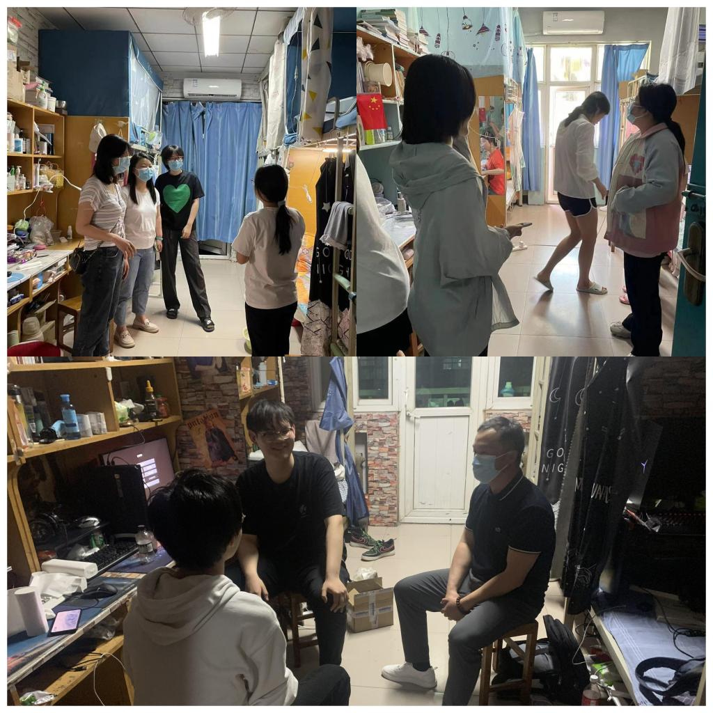 在学生宿舍,各位领导老师详细了解了同学们在封校管理期间的思想、学习和生活动态,认真询问了他们的实际困难和需求,并针对如何合理有效地安排学习生活、调节身心状态等内容给予建议与指导。辅导员们嘱咐大家要严格遵守学校的疫情防控政策规定,认真配戴口罩,不信谣、不传谣,在做好个人防护的同时,保证线上教学的学习质量。要合理安排作息时间,劳逸结合,加强体育锻炼,鼓励大家保持乐观积极的心态,营造健康和谐的宿舍文化氛围,平稳顺利地度过封校管理时期。