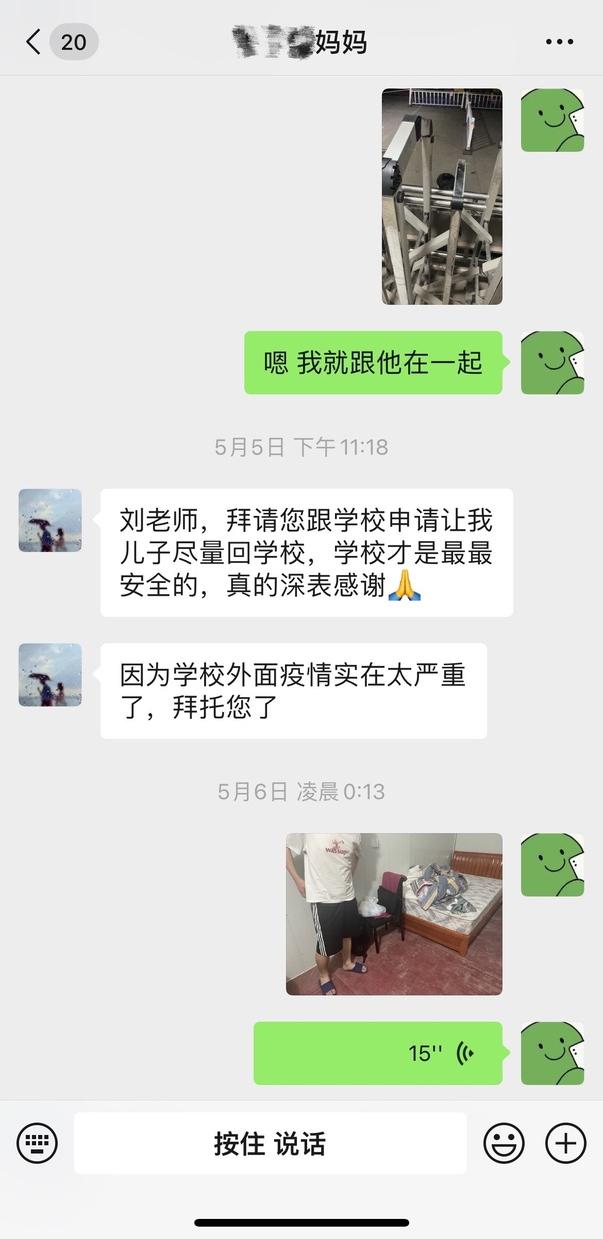 邓桐玲老师,在接到入驻学生宿舍消息后,顾不上家里孩子的哭喊,第一时间赶到学生宿舍,只为让学生安心,让家长放心。5月6日,刚下课的她听说有学生病了,急需转诊就医,外面大风呼啸,她二话没说,就开车把学生送到了医院。由于医院管控,她穿着单薄的上衣,在外面的寒风中等了学生近2个小时。在入住学校的这段时间,只要有学生突发疾病她都第一时间带学生及时就医,一趟趟往返于医院和学校之间......