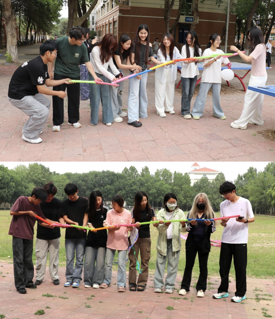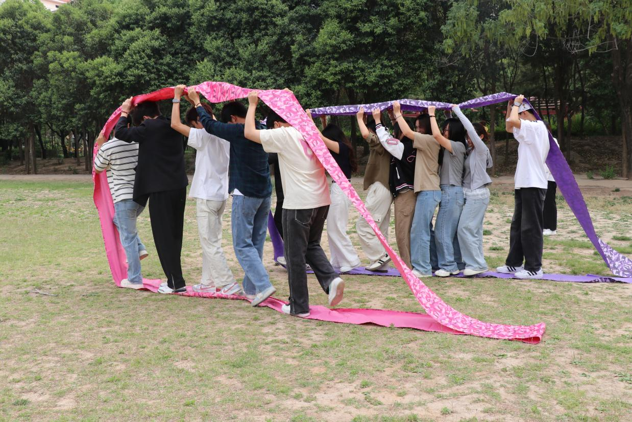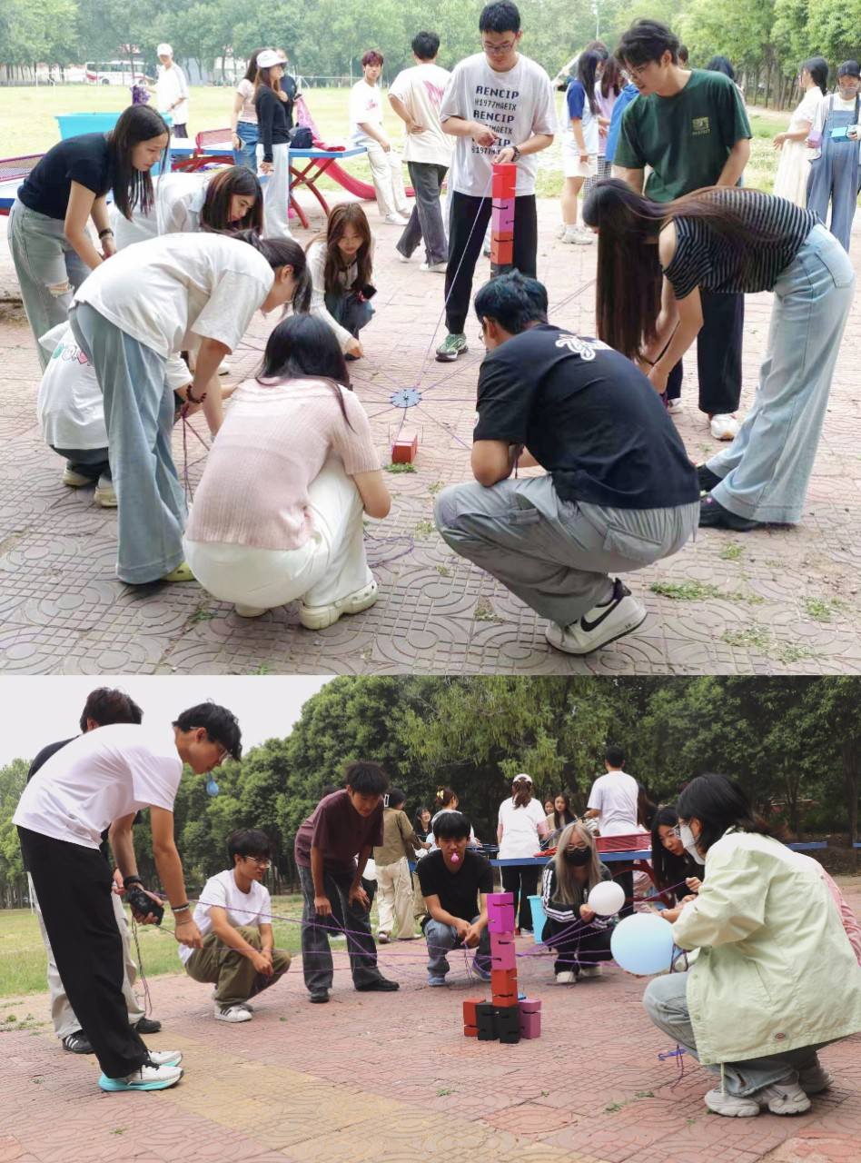 “乒乓球接力”环节,参与者需用长筷传递象征压力的“情绪小球”,一旦掉落便需分享一件近期感到焦虑的事,并在队友鼓励下继续挑战。这一设计让同学们在锻炼专注力的同时,学会倾诉与倾听。“心灵平衡积木”团队挑战要求成员用绳索协作搭建象征心理支持的立体结构,通过集体智慧探索解决问题的多元路径,强化抗压思维。