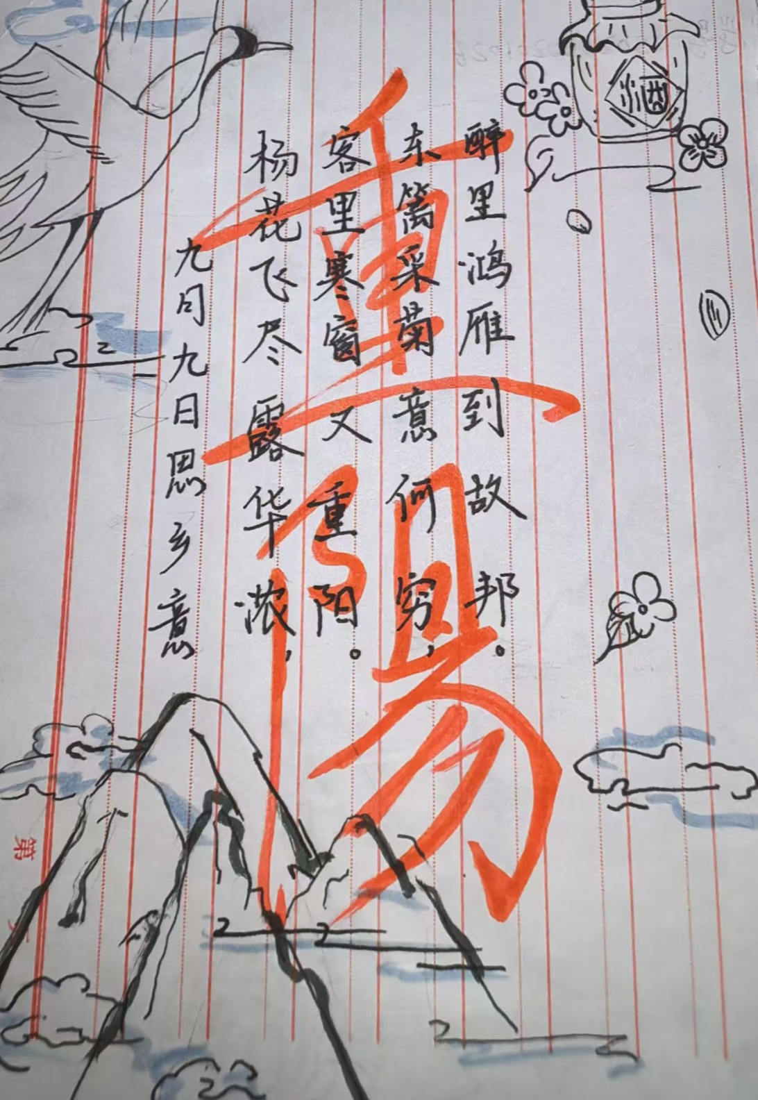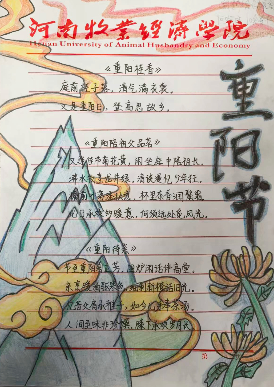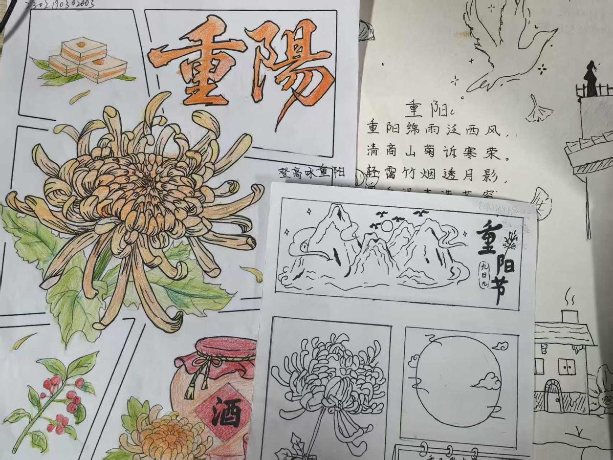 活动期间,同学们围绕秋日菊桂、登高望远、陪伴长辈、思念亲人等主题,以诗词创作与绘画或书法相结合的形式抒发情感、传递文化。纵览参赛作品,诗情画意间既有对秋日风光的赞美,又有对登高望远的憧憬。一字一句斟酌诗意,一笔一画描摹秋景,每一笔触里,都满是对重阳节的温情礼赞与美好期许。