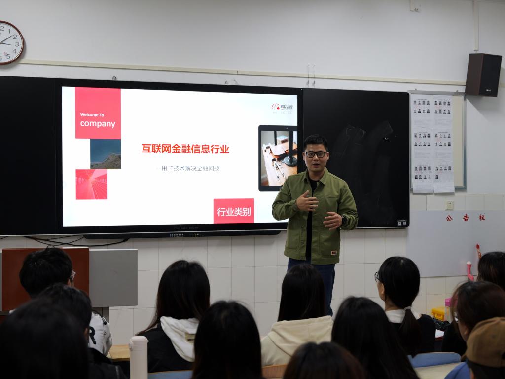 宣讲会伊始,企业代表播放了同花顺招聘宣传片,介绍了公司的发展历程、业务领域以及公司的核心价值观。同花顺是国内第一家互联网金融信息服务业上市公司,总部位于杭州未来科技城,是业内唯一一家国家信息化试点工程单位,能够给广大应聘者提供一个良好的工作条件和发展前景。宣讲会由同花顺公司的王鹏老师进行主持和宣讲,他向同学们详细介绍了公司的组织架构、岗位设置、薪资福利等方面的信息。展示了公司的成就和未来的发展前景,激发了同学们对于金融和营销行业的兴趣。