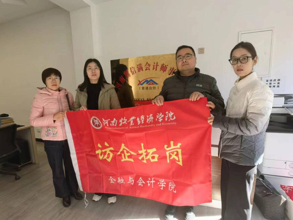 11月23日,世界杯体育官方网站财务管理教研室主任苗霞博士、副教授张宝丽老师、汪萍博士一行3人走进河南翼信满会计师事务所,开展访企拓岗促就业、双百助企促发展活动。